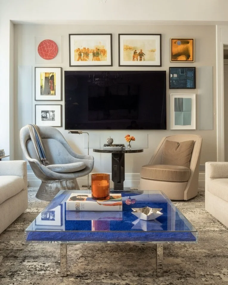 I love to enhance the space around a wall-mounted TV with a curated art collection that complements the room’s style. Consider wall size, TV dimensions, and aesthetic balance. Art should enhance, not overpower, the space. Mix paintings, photos, prints, or sculptures while maintaining harmony through color, theme, size, and texture. A well-balanced display shifts focus from the TV, creating a visually engaging and cohesive look.